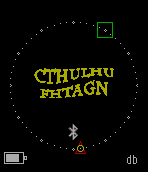The Elder Sign watchface elements refer to the Cthulhu mythos. The main display shows the Elder Sign with the watch hands represented by a circle (seconds), triangle (minute) and square (hour). Special features include: * When the second hand (circle) coincides with the minute hand (triangle) the display changes to read "Cthulhu Fhtagan" (meaning "Cthulhu Dreams"). * When the second hand (circle) coincides with the hour hand (square) the display changes to show the Necronomicon sigil. * When the second hand (circle), minute hand (triangle) and hour hand (square) coincide, the watch vibrates to notify the wearer that the "stars have aligned" (for this hour) and the display changes to show a depiction of Cthulhu until the minute changes. The watchface also includes a bluetooth connectivity indicator, vibration on bluetooth disconnect and a battery level indicator.