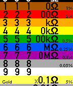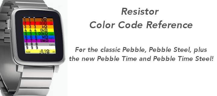 Quick reference tool for electronics, including resistor color code. Supports color on the new Pebble Time/Pebble Time Steel watches. Also functions on the older black-and-white models (using text rather than color). Suitable for standard 4 and 5 band resistors.