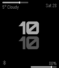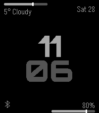 Watch face that shows information on 4 corners: Top left: Weather info with bar indicating the max/min temperature of the day and where we are in this range right now Top right: Date Bottom left: Phone connection state and phone battery Bottom right: Watch battery state