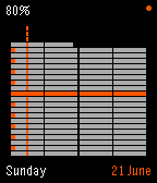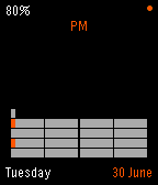 Equaliser is a new take on telling the time. It has the following features: - Battery level display - Day of the week and date - Bluetooth connectivity indicator (with vibrate on connect/disconnect) - Support for 12 and 24 hour time format - Ability to disable the second hand via the configuration page (to preserve battery life) How does it work? Rows fill up from the bottom to the top - Each complete row represents an hour that has passed since midnight. Columns fill up from left to right - Each column represents a minute that has passed since the previous full hour. Seconds are represented by the orange line that moves horizontally across the screen. When it reaches the end, a new column is filled in to indicate a complete minute. There are a few markers to assist with readability. Orange blocks are displayed down the left hand side at every 2 hour increment. The orange horizontal marker represents midday. The black vertical markers are 15 minute increments with the thickest being half past the hour. Example: 3 rows are filled. A 4th is partially filled just past the first vertical black line. The time is therefore just gone 3:15am. I hope you enjoy it :)