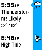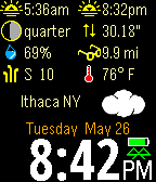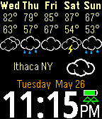 This is a full weather station at your fingertips (or at least your wrist). The GPS from your smart phone finds the closest monitoring station from one of five services. Information includes sunrise, sunset, moon phase, air pressure, humidity, cloud coverage, wind, temperature, and see forecast info with a wrist shake. Customizable for weather service, units, language, screen, vibration, etc. Now with Timeline pins: daily weather forecasts are pushed to your Pebble.