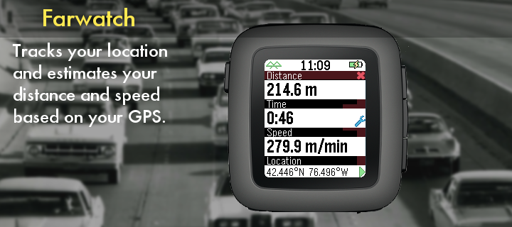 Farwatch is an odometer and speedometer. The smart phone GPS tracks distance and speed. The watch displays current time, elapsed time, elapsed distance, and average speed. Tap or flick your watchface to switch between average speed and current speed. Customizable settings include units, screen display, battery indicator, connection indicator, tap control, and vibration alert upon disconnect. It helps to launch this watch 20-30 seconds before you start your trip. This gives your GPS time to get an accurate starting location.