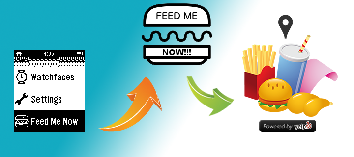 Now supports # Feed Me Now!!! Get food places suggested based on your location and Yelp API. How to use: 1) Open the app and wait to see a suggestion. 2) Shake your pebble to get a new suggestion. 3) Click select button to open full info from Yelp mobile version on your phone. ## Demo pebble watch app for training purposes (Pebble.js) Features: - geolocation (current position) info from the phone. - Ajax requests to Yelp API (food options near you) - Uses different UI components, Vibrate and accelerometer sensor. - Triggers new window on the phone for detailed view. - Distance calculation. Spanish # Alimentame Ahora!!! Obtiene lugares para comer sugeridos en base a tu posición y la API de YELP. Como usar: 1) Abre la aplicación y espera a ver la sugerencia. 2) Sacude tu pebble para obtener una nueva sugerencia. 3) Click select para una vista detallada en la version mobile de Yelp. ## Aplicacion de muestra para pebble watch. Para uso educacional (Pebble.js) Features: - geolocalizacion (position actual) obtenida desde el movil. - Llamadas Ajax a la API de Yelp (opciones de comida cerca tuyo) - Utiliza diferentes componentes de UI, Vibrate y sensor acelerometro. - Dispara una nueva ventana en el movil para vista detallada. - Calcula distancia.