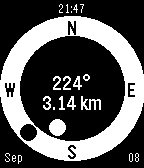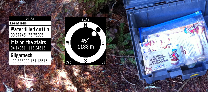 Geocache companion for Pebble! Configure to set multiple cache locations. Use a simple menu to choose a cache and follow easy directions to find it. Your heading (the white dot) is estimated from the movement of your phone. Align it with the target direction (black dot).