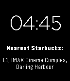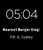 A watchface that uses the Foursquare API and your Pebble's location to let you know at all times where your nearest place of interest is. By default, it'll tell you where the nearest Starbucks is. Not a fan of Starbucks? Not a problem. Change the settings to direct you to your nearest McDonald's, Subway, gym franchise, Chanel boutique... anything on Foursquare. It's fun.