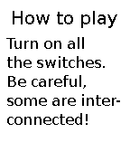 Turn on all the lights, but it's not as easy as just flipping the switches, someone has gone and interconnected them, it's up to you to figure out the connections! Controls:- Up/Down - Move cursor Select - Toggle the current light (and any others connected to it!) Squeezing in 1024 levels, each carefully created by genetic algorithm. How long will it take you to do them all? ;-) Compatible with IOS and Android.