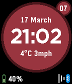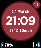 Mars Red orbital circles displaying time (including seconds), date, current temperature and wind speed, graphical and numeric battery level (with charging indicator) and Bluetooth disconnection alert. On Bluetooth connection lost, icon will flash for 20 seconds before vibrating to confirm connection lost. Useful reminder if you leave your phone behind when leaving the house! If weather cannot be loaded within 60 seconds (due to no bluetooth or internet connection) the day of the week will be displayed until connection is re-established.