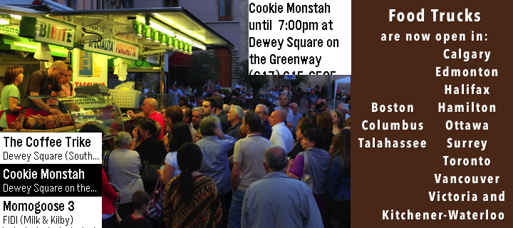 Find currently open food trucks. Welcome, Eugene! Handy if you travel to, live or work in these cities: Boston, Vancouver, Tallahassee, Calgary, Toronto, Edmonton, Halifax, Hamilton, Kitchener-Waterloo, Ottawa, Eugene, Columbus and Victoria. Request your city from my website.