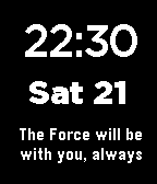 This watchface is for the Star Wars fan. The phrase change per minute. May the Force be with you ! ver.1.4 - fix garbled character phrase ver.1.3 - add some of phrases ver.1.2 - fix day line feed bug ver.1.1 - change phrase selection as random - add few new phrase