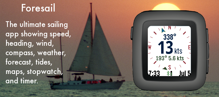 The ultimate Pebble sailing app! Displays your realtime speed and heading, along with wind speed and direction on a compass dial. Other screens include the current weather conditions, weather forecast, tide information, a zoomable map, and a sailing timer. You can switch screens using a long press to the up or down buttons. The select button on the Pebble activates the screens and settings menu. Speed and bearing is calculated using the smart phone GPS. Use the up and down buttons to zoom the map. The menu has a button for refreshing weather (or the map if it is visible). Select from several different weather services, including OpenWeatherMap.org, Yahoo Weather, NOAA, and the commercial service Forecast.io for premium subscribers. If tide is activated, the nearest NOAA or Canadian station is used to display tide information. GPS is used to find the closest weather station unless a manual location is entered. Customizable settings include the speed units (knots, mps, mph, kph), temperature scale, air pressure, date format, battery, connection, vibration alert, backlight, and more. SetPebble subscribers have access to Forecast.io weather information and more-frequent updates. Mapping tiles Copyright and courtesy of OpenStreetMap, OpenStreetMap contributors, Google Maps, ESRI ArcGIS, Stamen, and NOAA. Stamen data by Stamen Design (http://stamen.com); OpenStreetMap (http://openstreetmap.org) mapping tiles under Creative Commons licenses.