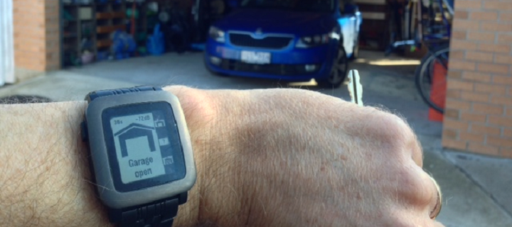 Remote control for the Garadget garage door controller. Shows door state, time since last change and wifi signal strength. Controls are as follows: Up: open door Down: close door Select: check door status and if you have more than one door: Long up: go to previous door Long down: go to next door