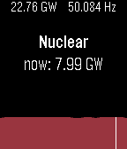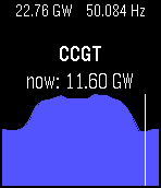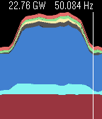Overview of the previous 24 hours of Great British electrical power generation, using data from http://www.bmreports.com/. The present grid frequency and (known) generation output is shown at the top. The up and down buttons can be used to scroll through each generation type. Midnight is shown by the white vertical line.