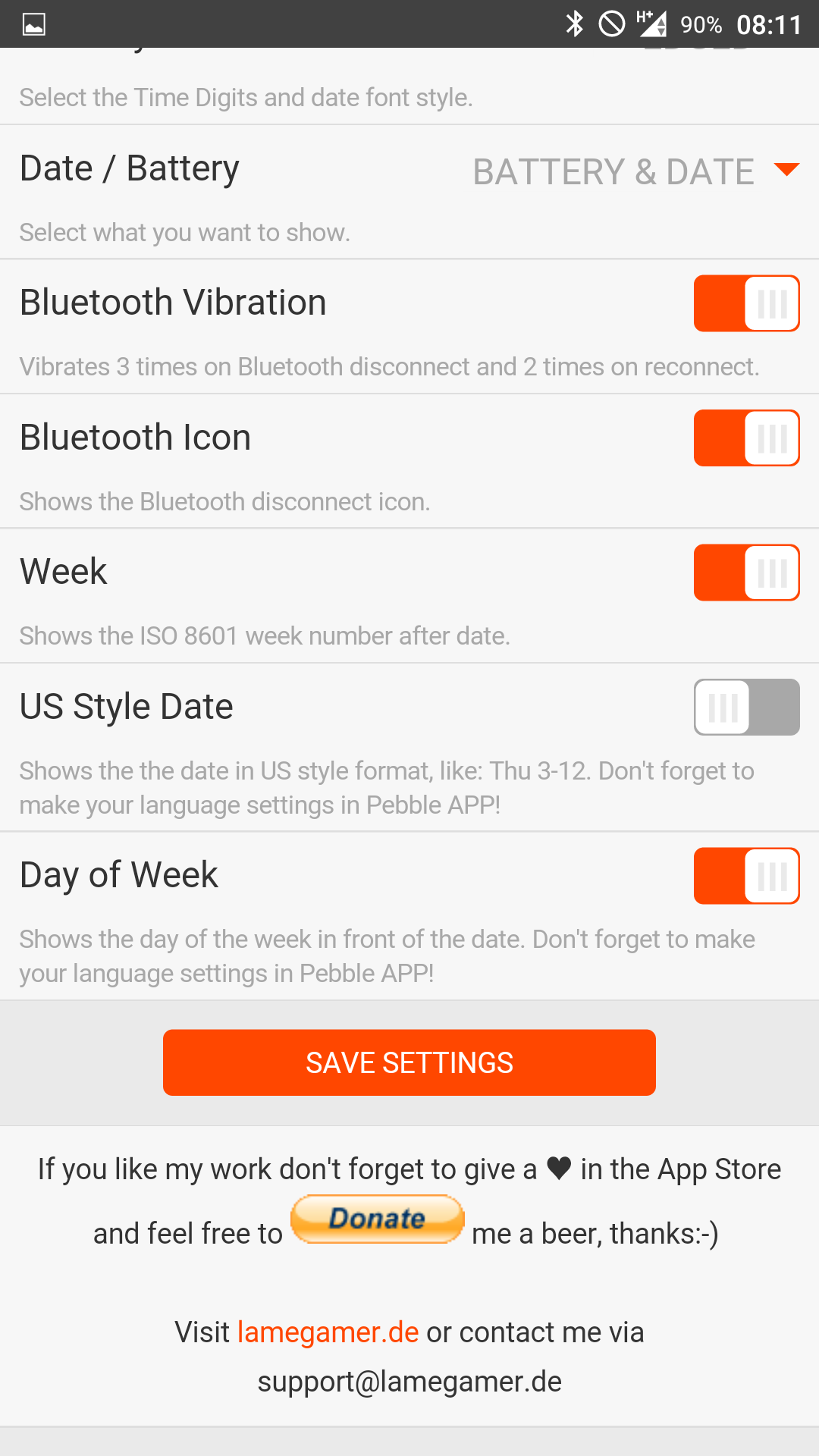 Simple and clean or geeky?! - You decide! Nearly everything configurable: -Color of background, battery, date, time and bluetooth icon -Font style (Edged, Digital, Star Trek Klingon :-D ) -Battery bar -US-styled date -Week day -Date -Calendar week -Bluetooth vibration -Bluetooth icon Customize it to your own with 64 possible colours! Formerly known as G-Color