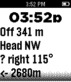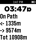 Shows status messages from the companion Android phone app, GeoTrail. Also the time of day is always displayed.