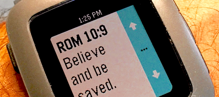 A simple reference app to help share the gospel. Features: - Collection of key gospel verses arranged in order of gospel presentation - Summary view with just a verse reference and a short description so you can take a quick look at your wrist and open your preferred bible. - Press select in the summary view to view the verse itself (handy if you don't have a bible with you) - Long press in summary view to see a short explanation of the verse (just in case you find it difficult to explain the verse yourself).