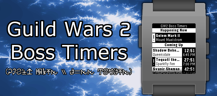 This app displays a simple list of timers for the next several world boss events in Guild Wars 2. No Internet connection required. Uses the schedule information from the June 17, 2014 game update. See the README at the source link and the GW2 forum thread for more detailed information. Guild Wars 2 and all related assets are the property of ArenaNet, Inc.