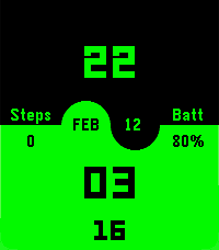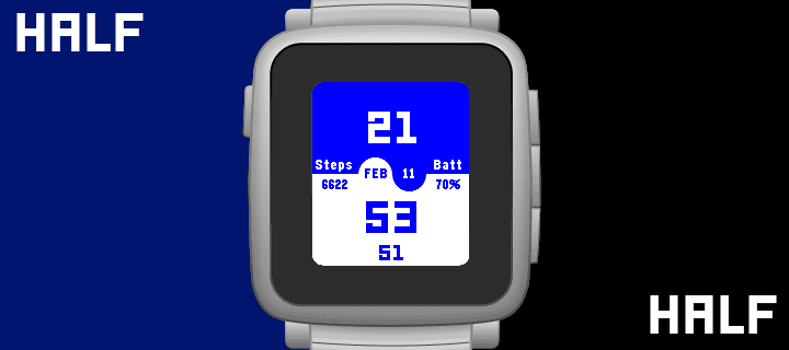 A digital watchface for Pebble smartwatches with a minimalist split-screen design. Configs: - Top Color/Bottom Color - Show Seconds - Battery saving: hide seconds after few a bit