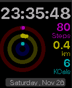 ***BASALT ONLY*** This watchface displays the number of steps, walking distance, calorie consumption . The pie graph shows the difference between yesterday and today . When the Bluetooth connection is lost, the message "NO CONNECTION" appears on the screen.