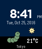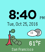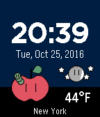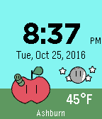 Say Hi to the Hungry Worm! This digital watchface features: • 12 or 24-hour time based on Pebble settings • Day and Night Modes • Hourly weather updates from OpenWeather.org o Manually refresh the weather by navigating to another screen and back • The Bluetooth monitor will show “Disconnected” when the connection is lost. • The Hungry Worm is your battery meter! As your battery drains it will eat the apple and get larger. Give the watch a charge to see the cycle again! • Settings page will allow you to change temperature, set manual location for weather, and day color mode. After you save, just navigate to another screen and back to see the change. One-Time cost of $0.99 + local taxes after 7 day trial. Your contribution will help fund my education (ʘ‿ʘ)