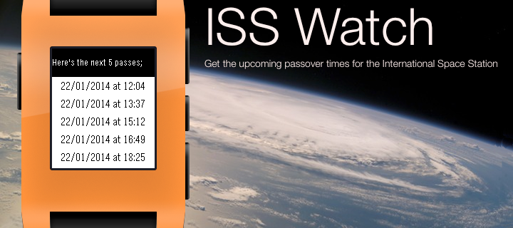 Get the upcoming passing times of the ISS (International Space Station) directly on your Pebble Watch. Start the App and after checking your current location it will show you the upcoming passover times, informing you when best to get out and look up. Watch out for future enhancements. Much more to come.