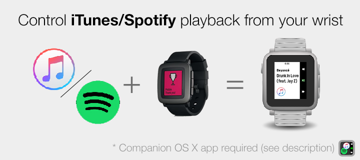 Control iTunes and Spotify on your Mac using your Pebble, just like the Music app! You'll need to run 'iTunesify Remote for Pebble' on your Mac. On your Mac, go to bit.ly/pebble-itunes-mac and follow the instructions for setup (no longer than 2 minutes!) You can currently play/pause any song, go to the previous/next song, view the current track's name and artist and control the Mac's volume!