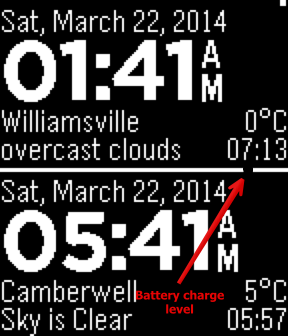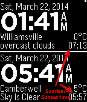 - Local clock - Local weather - World clock - World weather - Hourly beep - Battery charge level - Sunset/sunrise time