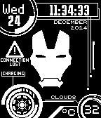 Iron Man inspired watchface. Programmed from scratch based on prior work by vvdofabio (http://www.mypebblefaces.com/index.php?cID=2226) and slayer1551 (http://www.mypebblefaces.com/concepts/1/100/) Features: - 12h/24h time in seconds - Date, weekday, year - Weather condition - Temperature - Battery level (turns into Arc Reactor when charging) - Bluetooth lost connection warning