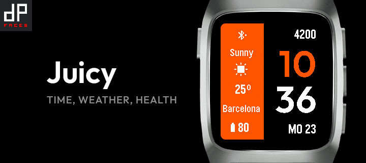 Free! --- Juicy is a watch face that packs all the essential info you need into a sleek, neat, and concentrated design—just pure substance at a glance! Time, Date, Step count, Weather condition, Temperature, Weather location (first 8 letters), Bluetooth connection status, and Battery level. Built during Rebble Hackathon #002 for Pebble. Designed and developed by dP-faces https://dp-faces.com/ --- Get the Premium Pack for a great price — it includes all current paid watch faces and any future ones I release. Thanks so much for your support! ❤️ https://bit.ly/dp-pebble