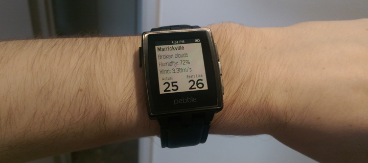 Gets current weather stats for current location. Update: Added choice of wind speed units in app config. Displays: Closest location weather data was retrieved from Description of weather Humidity Wind speed Temperature (nice and big) Apparent Temperature (what it really feels like) Default is Celsius, but can you change this in this apps config after installing it. If you have any suggestions, requests, recommendations feel free to email me! I welcome ideas. (Feel free to contact me to add more weather providers and I'll see what I can do) I made this app because I wanted a weather app to access from the app list, which was not a watch face, and was ONLY for weather. This way my main pebble watch face can be only for time.