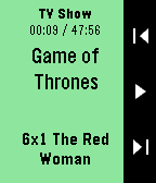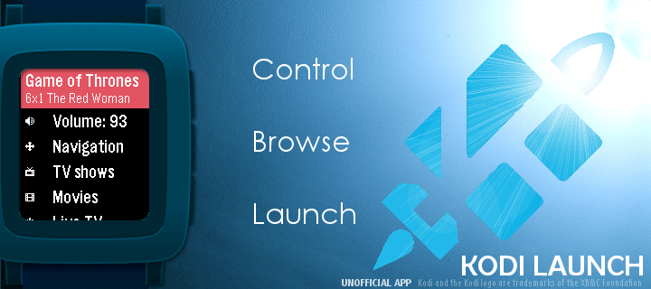 The most complete controller and library browser for Kodi! (This watchapp is unofficial and not endorsed or supported by Team Kodi or the XBMC Foundation. Kodi and the Kodi logo are trademarks of the XBMC Foundation.) Quickly control your Kodi instance, browse your video library and PVR channels, and launch your media from your wrist! Features: - Now playing screen - Volume control - Automatic refresh - Navigation mode (see below) - TV shows browser: recently added episodes, last played, unwatched. Reports the number of episodes watched/to watch for each show & season, displays the air date and a mark for watched episodes. - Movies browser: recently added movies, last played, unwatched. Displays the rating and year of each movie. - Exits to the watchface after launching a movie or TV show episode (this is by design) - Live TV browser: display channel groups and channels - System actions: toggle fullscreen, info & codec display, update video library, party mode, suspend/reboot/shutdown the system. - Sets the app glance to the last launched media using the app. A note about navigation: The navigation mode uses the 4 buttons of your watch. Hold Back to return to your watchface. Double-click the Select button to perform a selection in Kodi, double-click the Back button to go back in Kodi. Music browsing & launching is not implemented (yet).