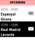 Stay on top of Spanish football right from your wrist. Track La Liga matches, standings, and never miss a game with timeline integration. Features: - Live Scores - Real-time match updates with current scores and match minute - Upcoming Matches - Browse scheduled fixtures with kick-off times - League Standings - Full table with points, goal difference, and position indicators for Champions League, Europa League, and relegation zones - Timeline Pins - Add matches to your Pebble timeline with reminders 1 hour and 15 minutes before kick-off. Scroll for details including stadium, referee, and matchday info.