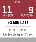Start Locomo when going to work or returning home and stop worrying about which train is next and which platform you need to go to. Locomo will show you how much time you have left, if your train is on time and which platform you need to go to. It uses geolocation to detect if you are going from home to work or the other way around. Use the up and down buttons to navigate to earlier or later trains (or refresh by going all the way up). The middle button will switch modes between going to work or returning home. Only works in the UK (for now).