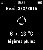 Application pour connaitre la météo où l'on se trouve avec la géolocalisation via le GPS de votre smartphone. Affichage le temps en cours, et le temps sur les 5 jours suivant en naviguant avec les boutons de la montre.