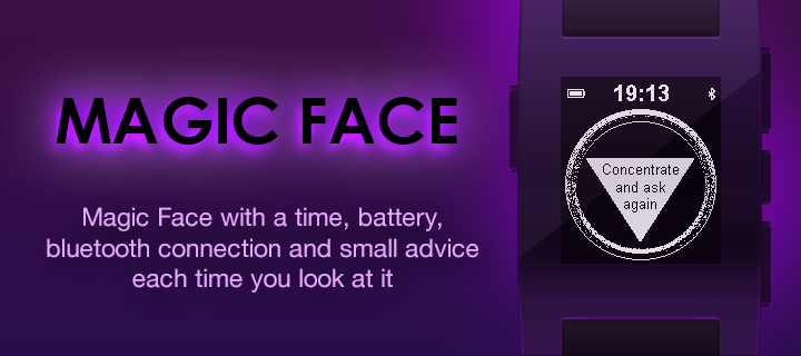 Magic Face with a time, battery, bluetooth connection and small advice each time you look at it. TAP or SHAKE or SELECT to get a magic answer. Enjoy:) Available in versions as an App and a Watchface!