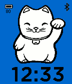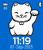 Cute maneki neko(lucky cat) on your watch and bring good luck to you:) Beckoning and move mouth every minute. Through configuration page, user can - set background color - set text color - enable to show date - enable to show bluetooth connection icon - enable to show battery level and icon - enable to vibrate when bluetooth connection lost - enable hourly vibration (turn off by default) - enable to show phone battery level if phone browser supports(it seems only android supports in the meantime)