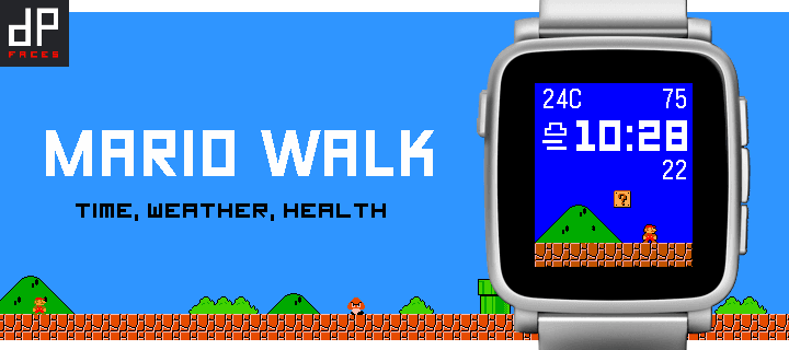 Free! --- Mario walks if you walk! The Mario's walk consists of 8 different stages, 10 screens per stage, and you choose 50, 100, 200 or 400 steps per screen. A live watchface with 80 different landscapes + multiple background colors in GAME COLOR / COLOR WEATHER presets option. Time, Day, Step count, weather condition, weather temperature, battery charge status, bluetooth connection status. Designed and developed by dP-faces https://dp-faces.com/ --- Get the Premium Pack for a great price — it includes all current paid watch faces and any future ones I release. Thanks so much for your support! ❤️ https://bit.ly/dp-pebble