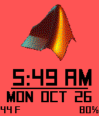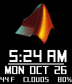 A MATLAB-themed watchface with the following customizable features: -- Rotating MATLAB logo (optional) -- Temperature -- Weather conditions -- Battery percentage -- Charging status -- Bluetooth connection status