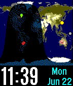 View a mercator projection of the earth tracking the progress of the sun and moon. There are three earth displays: Living Earth, NASA Blue Marble, and Visible Earth. The International Space Station can also be tracked, and for world travelers you can view your location on our planet. There are four possible icons: sun, moon, your location (red push-pin), and the ISS (red icon). There are custom options for date format, screen background, turning on and off the icons, switching between earth images, refresh rate, and more. Note that ISS tracking is updated twice a minute, which uses phone data and Pebble battery. The most battery-efficient settings are to not track ISS and turn off your GPS location, which means the time updates every minute and the globe recalculates the sunlight areas depending on the refresh setting which has a one-hour default.