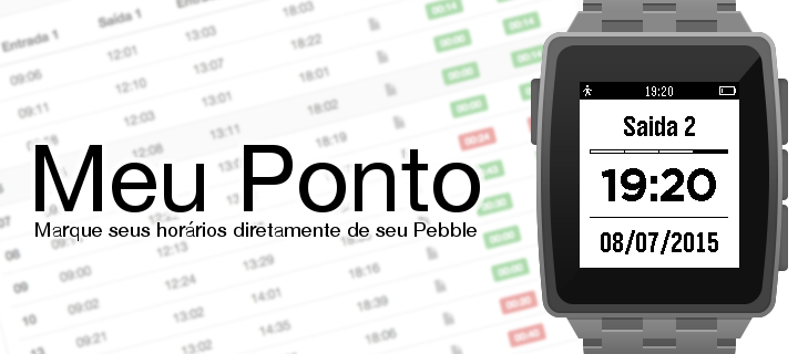Meu Ponto é um aplicativo para controlar os seus horários de entrada e saída do trabalho e saldo total de horas. Meu Ponto para o Pebble permite que você registre os horários na sua conta do Meu Ponto, em tempo real, diretamente do seu Pebble. Você poderá editar e ajustar tudo através do Meu Ponto em seu browser caso necessário. Antes de usar o Meu Ponto para o Pebble, você precisa: - Registrar-se no Meu Ponto em: http://meu-ponto.appspot.com/ - Acessar o menu "Configurações" no website - Selecionar a opção "Integração" e confirmar - Copiar as informações fornecidas (User e Token) - Abrir "Settings" do Meu Ponto no Aplicativo Pebble do seu telefone - Inserir as informações copiadas e salvar Controles: Botão UP - clique curto: muda o tipo de registro - clique longo: envia um registro usando os dados da tela Botão SELECT - clique curto: volta 1 minuto - clique longo: muda para a hora/minuto atual Botão DOWN - clique curto: volta 1 dia - clique longo: muda para a data atual