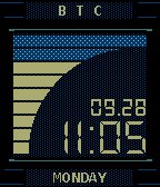 Based on the original MGS Codec. - Bars light up to indicate watch battery level - BTC or PTT text at top indicates BlueTooth Connection - Day of week displays at bottom - ">" icon shows up when charging