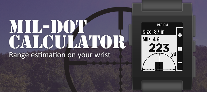 Given a target of known size and a mil-dot measurement from the reticle of a scope or binoculars, this app estimates the range to target. Works in inches/yards or centimeters/meters (long select button press to switch between them). Tell me what you think: https://twitter.com/MisterOuchie