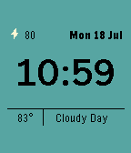 A minimalistic watchface with the key essentials. Weather is provided by Forecast.io (no API Key Required!) Features: - Weather Updates every 45 minutes - Bolt/Heart displays the current battery level - Displays the current apparent temperature and the hourly summary condition - Weather uses GPS or Fixed Location - All colours are configurable - Alternative Time Font - All Text elements can be bolded - Vibrates on Bluetooth disconnect