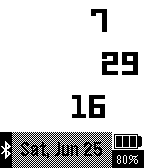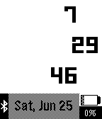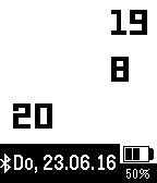 Simple modern watch showing hour, minute and second in three lines. The actual date (in german version) is shown on the bottom. The battery state with a symbol and a value is shown in the right bottom corner. The bluetooth connection state is displayed on left bottom corner.