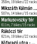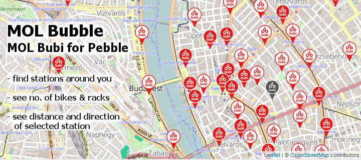 Unofficial Pebble app for MOL Bubi, the Budapest public bike-sharing system. It lists the docking stations, closest first, showing the distance, number of available bikes and the total number of racks for each. By selecting a station (using the select button), the approximate distance and direction are displayed, conveniently guiding you to the station. Works in Budapest, Hungary only.