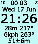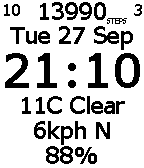 This watch face displays the following: - time zone - phase of the moon (0-29 days, 0=new, 14=full), - location of the moon (0-99 x ~15-minute intervals), or - any one of Pebble's health metrics such as steps, distance, active time, sleep, kcal burnt, - link status (! if lost), - am/pm - battery (0-10), - date, - time, and one of - latitude, longitude and altitude; - distance and direction to a reference point, speed and heading, altitude; - street address; - weather with temperature, wind and humidity/rainfall; or - weather with temperature, air pressure and humidity/rainfall. If you obtain and enter an API key for Weather Underground in the settings then it will use that instead of OpenWeatherMap. These are updated every minute, five minutes or half-hour as per your settings, or triggered by a vigorous shake along the Y axis of the watch (6 to 12 o'clock). The moon location should be accurate to a standard deviation of about five minutes - 0 corresponds to the moon on the opposite side of the earth and 50 to its being at its highest point in the sky. The reference location can be specified in degrees (e.g. -35.34532 124.45221), in degrees and minutes (e.g. -35,20.342 124,26.345), in degrees, minutes and seconds (e.g. -35,20,21 124,26,20) or as a street address that will be handed to Google to resolve. The display is designed for people with poor eyesight or reading under low light. If you make any enhancements to this, please send me a copy. If you like it, please give it a heart.