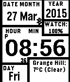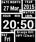Now available for Pebble 2 and Pebble Time 2!! Manual weather option and Master Key (pmkey.xyz) support now included. Version 3.50: NEW features added! - New-look configuration page - LIVE preview - options change directly on watch before pressing Save - Option to change date formats (UK & US style) - Option to vibrate when disconnected - Date displays the language chosen in user settings - Invert option now only shows in Classic Pebble and Pebble Steel ----------------------------------------------------------------- New version 3.0: Updated for Pebble Time Round!! Also new-look configuration page and bug improvements. --------------------------------------------------------------------- Release version 2.0: Colours added!! Settings page now includes options to change background and foreground colours. Original Pebble users can still use the options to invert colours. -------------------------------------------------------------------- Inspired by the Illuminator watchfaces created at Facerepo for the Motorola Moto 360 smartwatch, I have created the Pebble version. Displays full time (with seconds that can be hidden), date and watch battery level. The am/pm indicator disappears with the 24 hour format. Weather location, temperature and conditions are also displayed, and updates every 30 minutes, or when the watchface is loaded, whichever is sooner. The bluetooth icon serves as the connection indicator. It disappears when disconnected. Vibrations with each connection status.