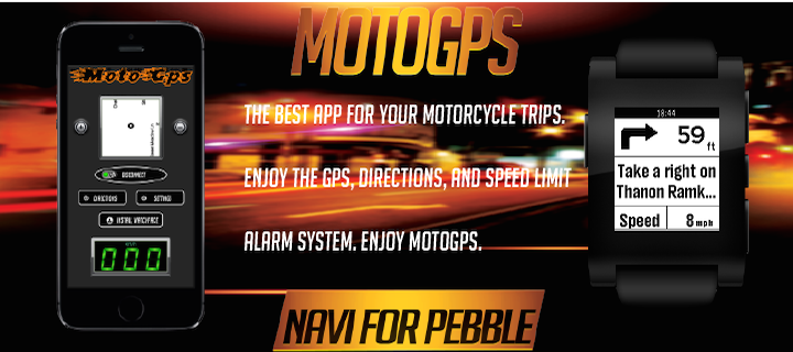 URGENT iOS 8 info: http://bit.ly/1tp75Wg MotoGPS allows you to use GPS Navigation and see maps on your Pebble. Additionally, for people with a heavy foot, a speed limit alert function has been integrated. Navigate your way to your destination while biking, cycling, running, or walking, and see navigation on your wrist. Save money by avoiding speed traps and police with the speed limit alarm.