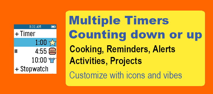 Multiple countdown timers for cooking, reminders, more! Multiple count-up timers (stopwatches) for timing activities and projects. Timers can be as short as a few seconds to multiple days. Timers run in the background and wake up the app 5 seconds before they finish. A variety of icons and vibrations are available to customize timers. A long press of the center button starts/stops timers from the main screen. A long press of the up button on the timer screen to delete the timer. UX design & icons, Nicola Schäppi, Werbeschluessel.ch