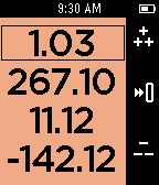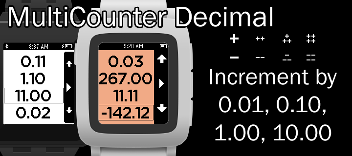 People are bad at remembering numbers. Pebble is good at always being on and displaying numbers. Use this app to count and remember up to 4 decimal numbers at a time. Don't worry about leaving to do something else with your watch, it will remember where you left off the next time you return. Use the right buttons to select which number to modify. Once you are modifying a number press the select button to switch between counting by 0.01, 0.10, 1.00, or 10.00. If you count high enough (or low enough) your number may run off the screen. Hold down the increment button or decrement button to count really fast or press and release to get a single count. Hold down the select button to reset the count to 0. Press the back button to return to selecting your number. Like all my apps, I don't want you to loose your phone so you will get a short long short vibration if your bluetooth is disconnected. An icon will show in the top left corner. Heart MultiCounter if you like it and check out Timeline and my Precisioneer watchfaces. I appreciate the hearts on those too! Counter