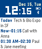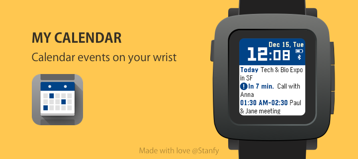 Displays 3 nearest events from your Google calendar - just login to your Google calendar in the app settings and you are ready to go. No companion app required. Works with iOS and Android. All features: - shows 3 calendars event - indication of upcoming event (in less than 10 minutes) - digital clock - current date - battery charge and bluetooth indication Controls: SELECT button - fetch events immediately.